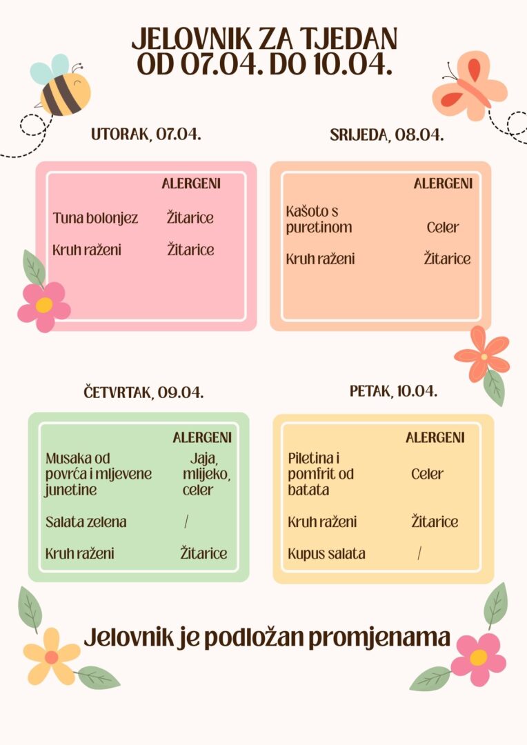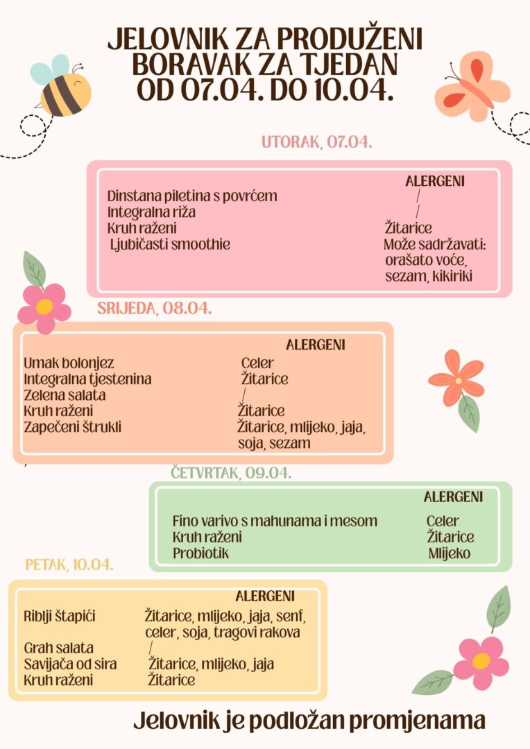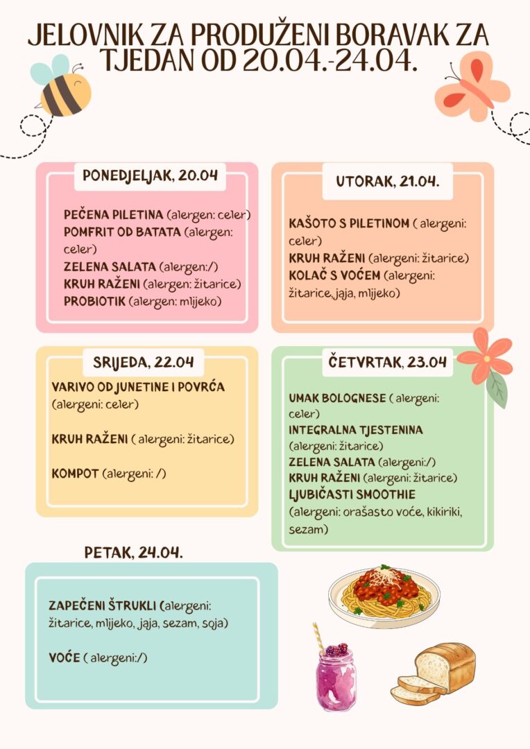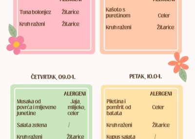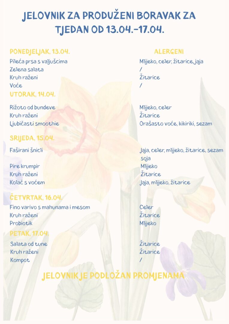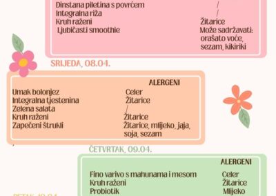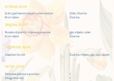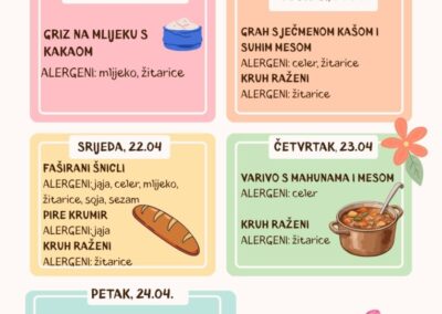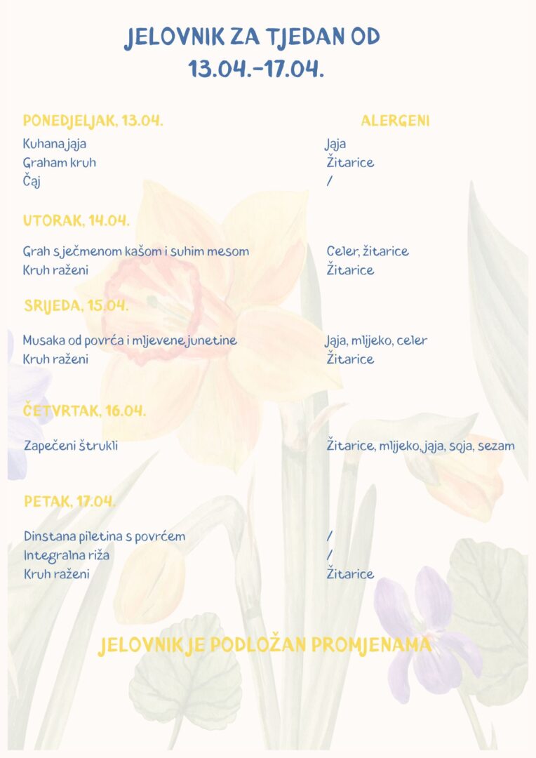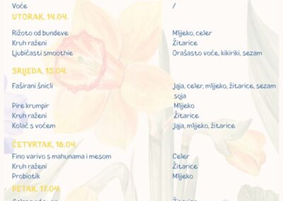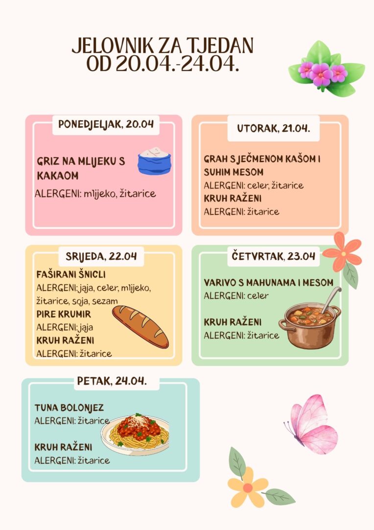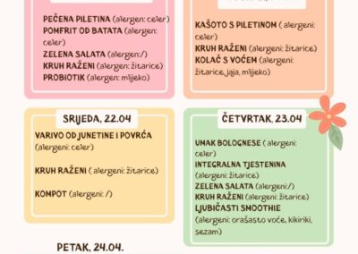 Travanj nam donosi duže i toplije dane, više boravka na otvorenom te povećanu potrebu za kvalitetnom i uravnoteženom prehranom. Naš jelovnik i dalje je usmjeren na raznolike, svježe i nutritivno bogate obroke koji učenicima osiguravaju energiju za učenje, ali i za sve proljetne aktivnosti.