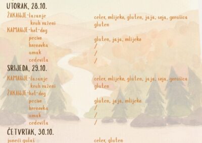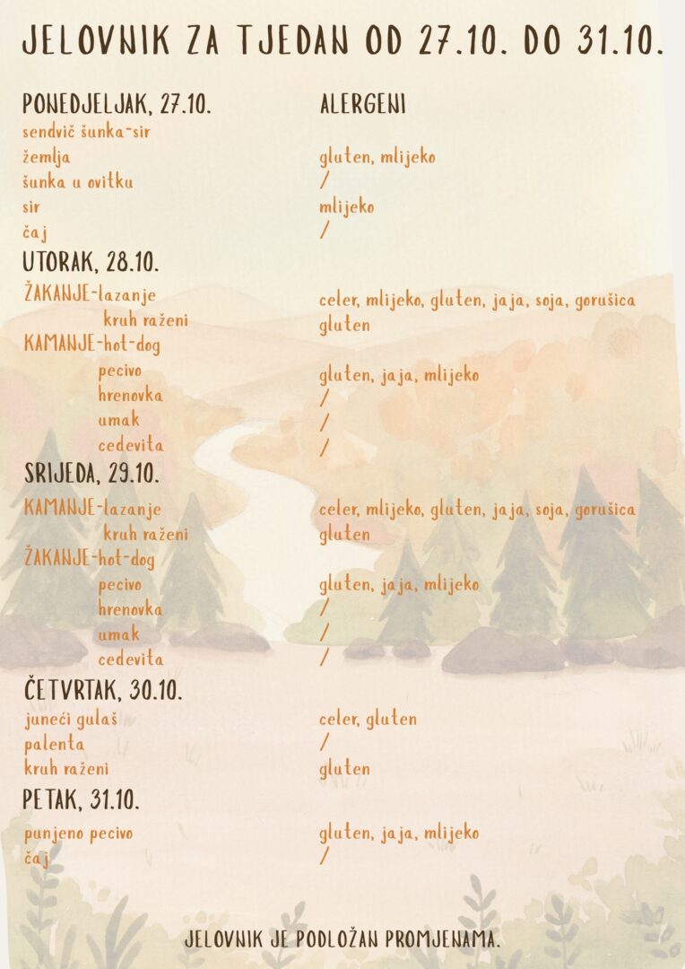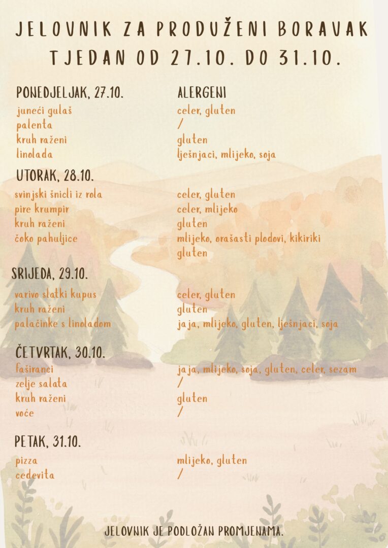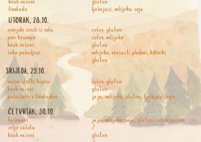 Listopad donosi šarene plodove i mirise jeseni koji se sele i na naše tanjure. U školskom jelovniku čekaju vas ukusna i zdrava jela koja griju, jačaju i daju dovoljno energije za učenje, igru i druženje.