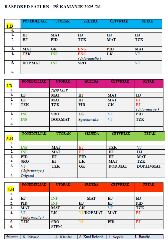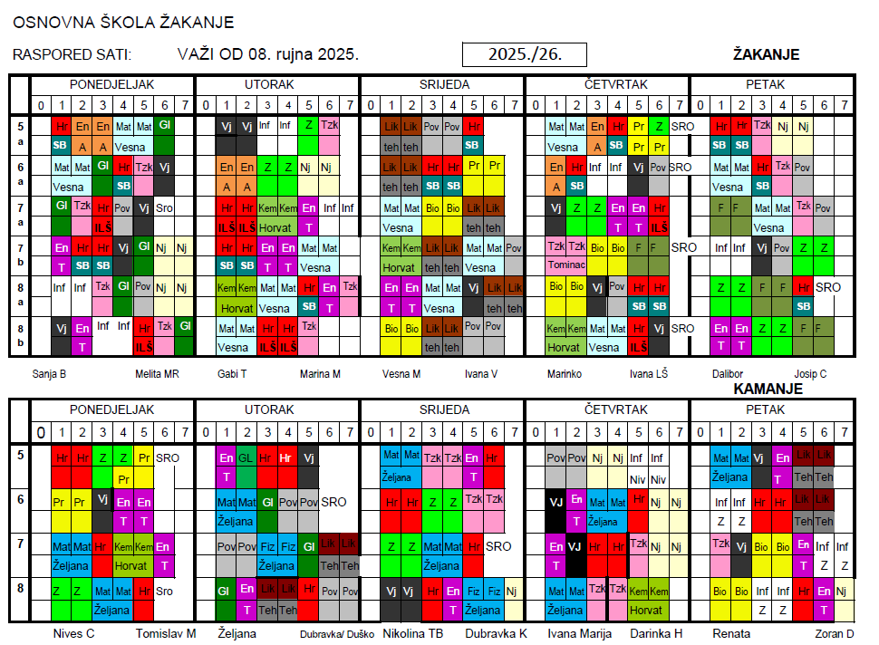 Kalendar rada i raspored sati školska godina 2025/26. Kalendar rada Raspored sati (predmetna nastava - šk.god. 2025/26.) Raspored sati (razredna nastava šk.god. 2025./26.) - OŠ Žakanje Raspored sati (razredna nastava šk.god. 2025./26.) - PŠ Kamanje