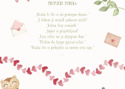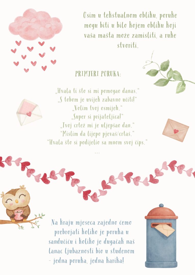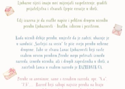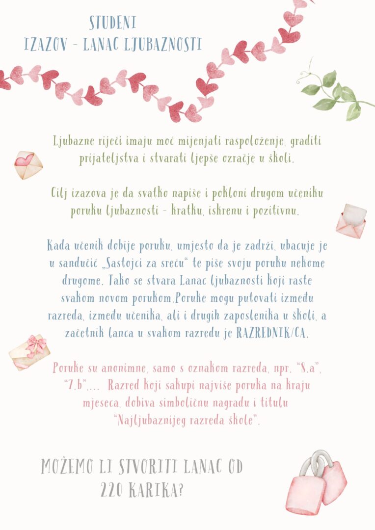 Vođeni tim vrijednostima, u našoj školi pokrenuli smo Izazov – Lanac ljubaznosti, kojim želimo potaknuti učenike da svakodnevno šire dobre poruke i stvaraju ozračje u kojem se svi osjećaju prihvaćeno i cijenjeno.