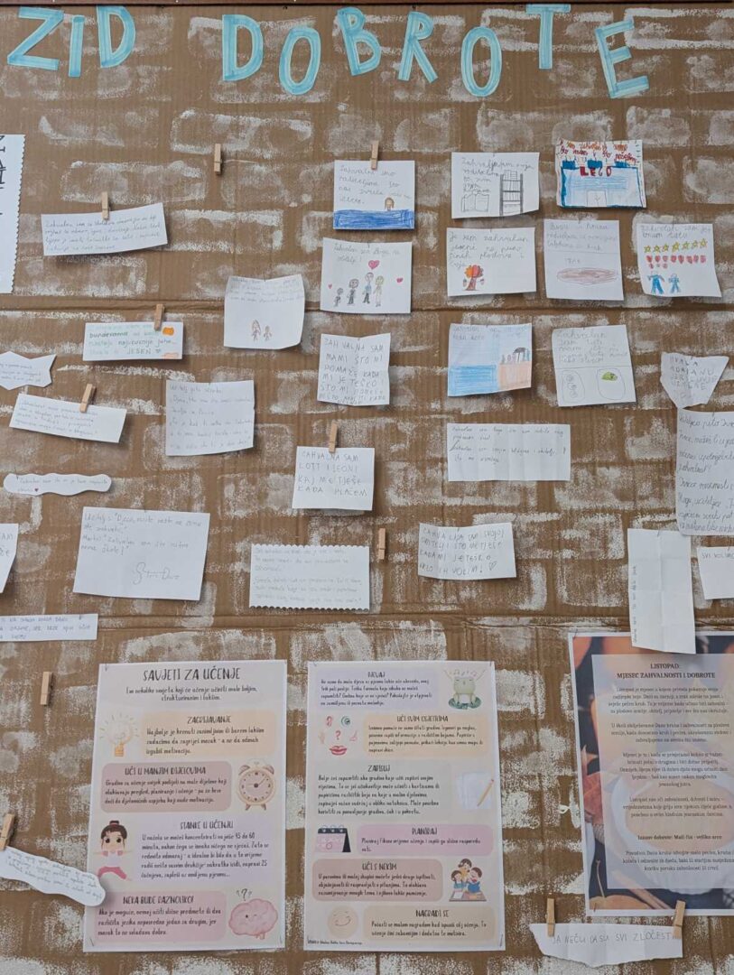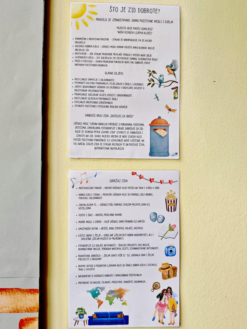 Zid dobrote poseban je kutić škole. Mjesto je to puno topline, zajedništva i pozitivne energije, gdje se skupljaju osmijesi, lijepe riječi i mala, ali velika djela dobrote. I obje ga naše škole imaju! Nastao je kao ideja da svatko od nas može učiniti nešto lijepo – napisati poruku zahvale, podijeliti lijepu misao, nacrtati osmijeh ili ispričati kratku priču o dobrom djelu.